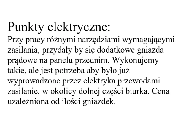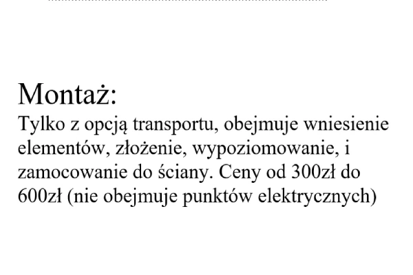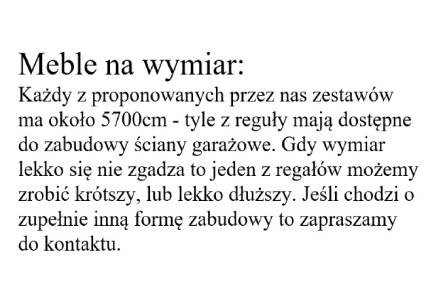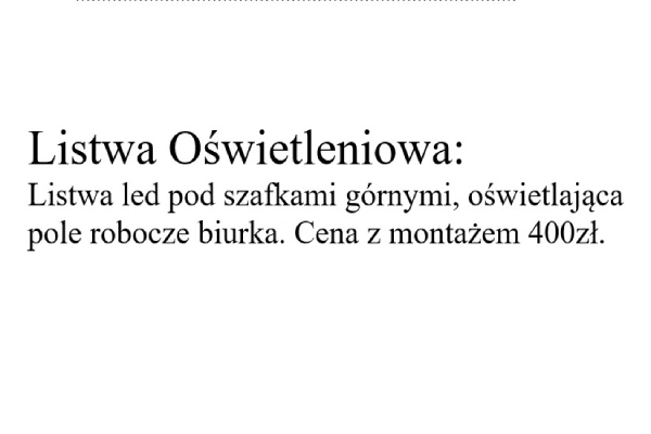 Różne elementy, i usługi które można dokupić osobno, lub zestawić własny komplet –kliknij na zdjęcie aby oglądać galerię. Szafa z frontami 200/80/42 wew188/76/40 – 1280zł Regał 5-półek 200/124/40 półka 118/40 – 1380zł Regał 6-półek 200/124/40 półka 118/40 – 1560zł Biurko 98/200/65cm z szafkami górnymi – 6900zł Biurko 98/200/65cm z blendą – 5700zł Biurko 98/200/65cm – 5500zł Biurko12-szuflad. Szafki górne – 7200zł Biurko15-szuflad. Szafki górne – 8200zł Biurko18-szuflad. Szafki górne – 9200zł Półka 180zł Transport Montaż Listwa oświetleniowa pod szafkami Dodatkowe gniazdka prądowe Zabudowa na wymiar Czas realizacji Lorem ipsum dolor sit amet, consectetur adipiscing elit. Ut elit tellus, luctus nec ullamcorper mattis, pulvinar dapibus leo.